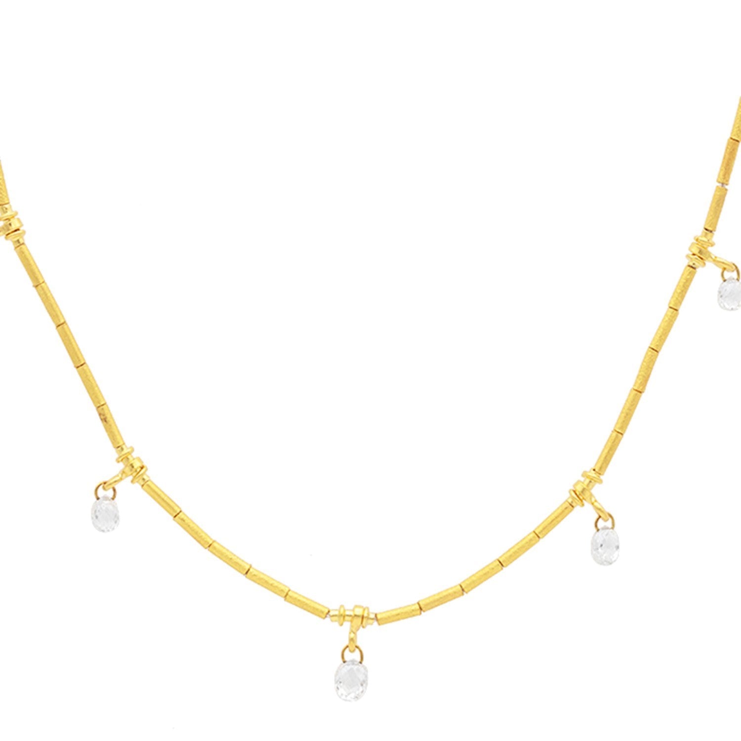 Gurhan One of a Kind 24KT Gold Tube Necklace Featuring A Single Strand of 24KT Gold Tubes and 5 White Diamond Briolette Charms (1.22 cts) on 16-18" Adjustable Chain with Mini 18KT Gold Lobster Clasp and Seed Pearl Accents